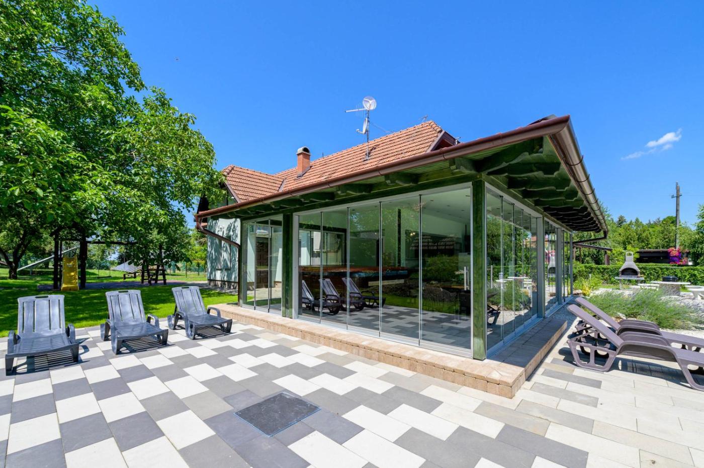 Villa. This luxurious villa provides a private pool, a hot tub and a sauna. The villas kitchen is available for cooking and storing food. Boasting a terrace with garden views, this villa also features air conditioning and a flat-screen TV. The unit has 11 beds.