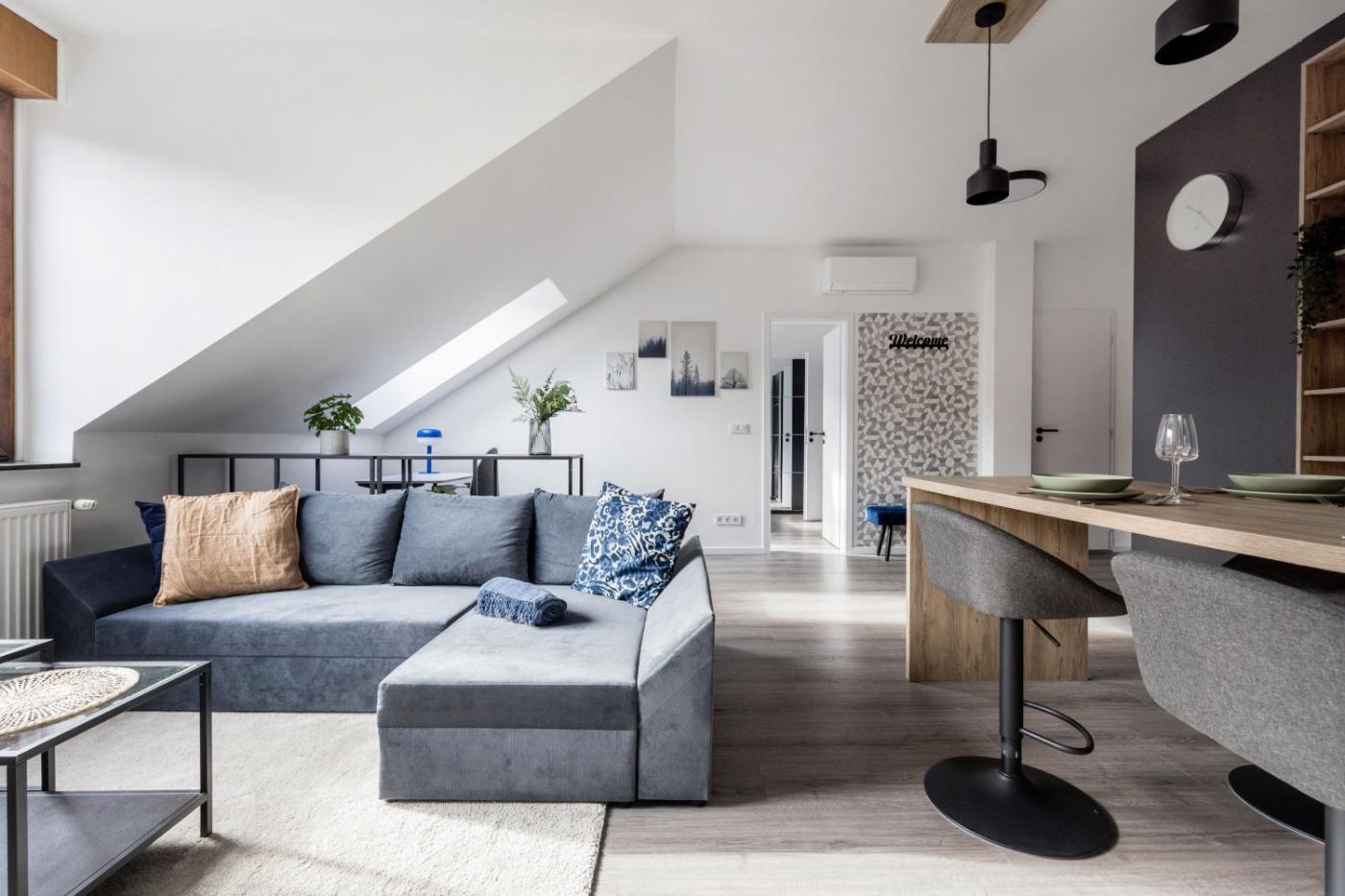 One-Bedroom Apartment. Featuring a private entrance, this air-conditioned apartment comprises 1 living room, 1 separate bedroom and 1 bathroom with a shower and a hairdryer. In the well-fitted kitchen, guests will find a stovetop, a refrigerator, a dishwasher and kitchenware. The apartment provides a washing machine, a coffee machine, a seating area, a dining area, as well as a flat-screen TV with streaming services. The unit offers 2 beds.
