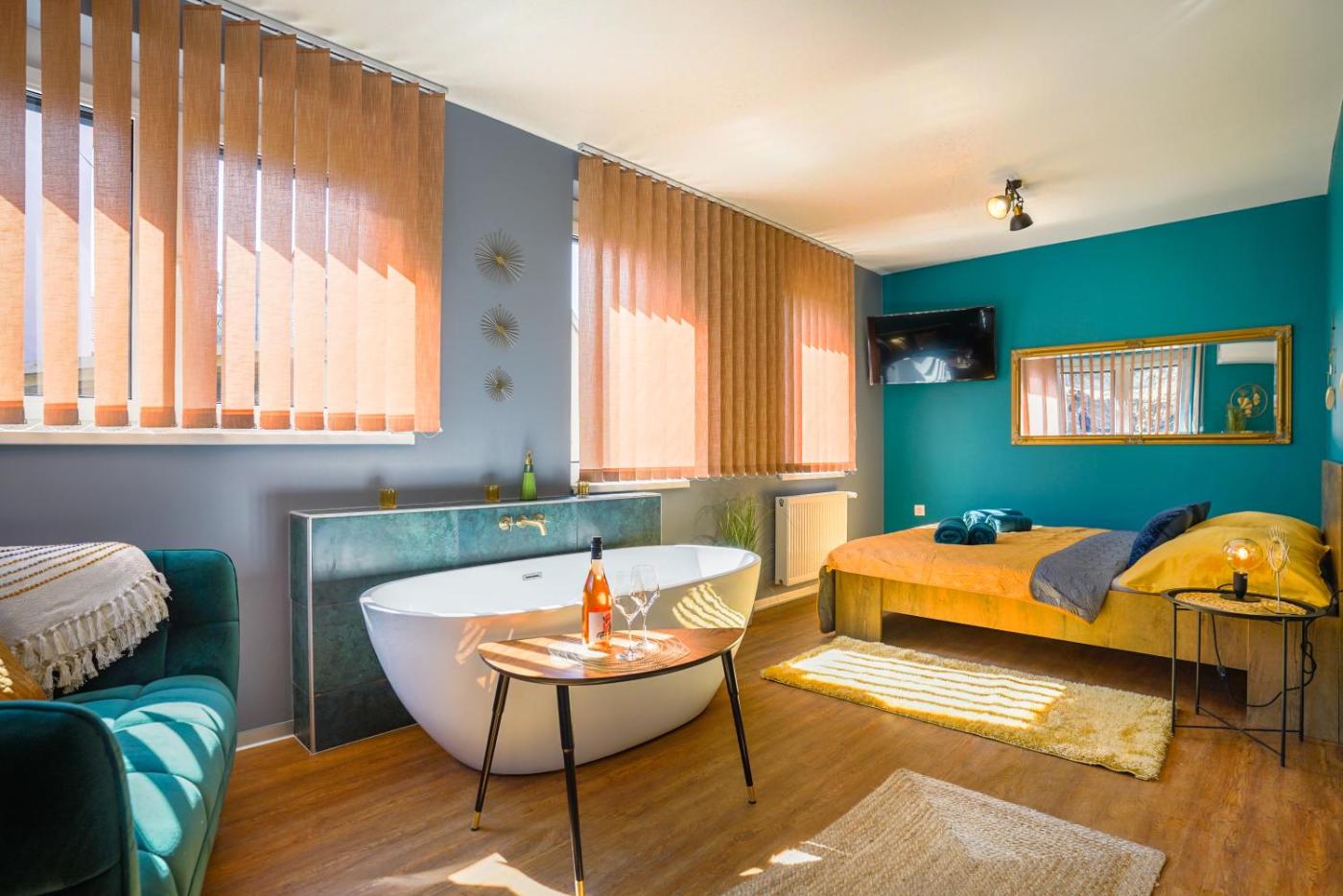 Studio Apartment. Boasting a private entrance, this air-conditioned apartment includes 1 living room, 1 separate bedroom and 1 bathroom with a walk-in shower and a bath. In the well-equipped kitchen, guests will find a stovetop, a refrigerator, a dishwasher and kitchenware. This apartment has a washing machine, flat-screen TV with cable channels, city views, as well as winechampagne for guests. The unit has 2 beds. ;